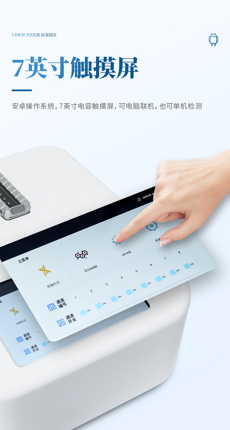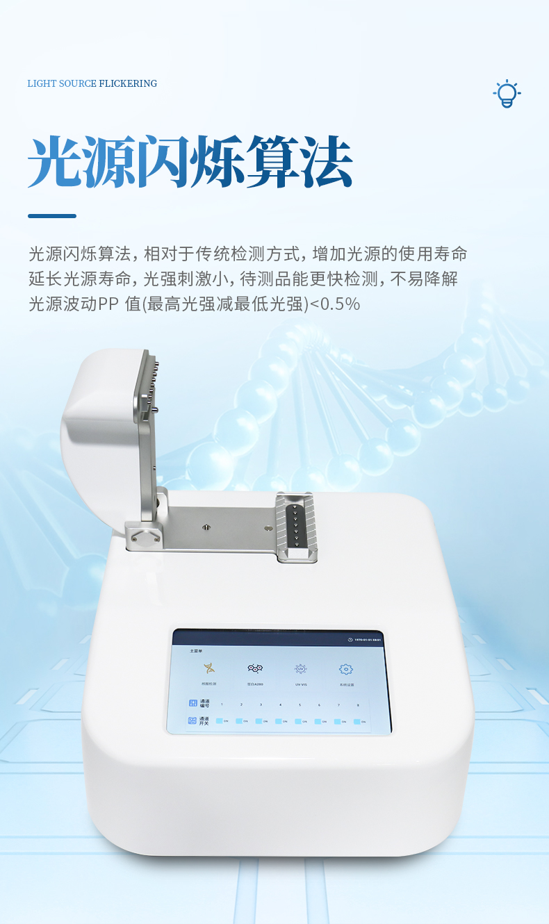 超微量紫外可見分光光度計(jì)單機(jī)和PC全部兼?zhèn)涞?-8可任意開啟的多通道全波長(190-850NM)微量分光光度計(jì)。可快速準(zhǔn)確的檢測核酸、蛋白質(zhì)和細(xì)胞溶液,核酸檢測每次測量所需要的樣品量僅需1至2UL即可。直接將樣品點(diǎn)于加樣臺(tái)上。無需比色杯或毛細(xì)管等附件。測量結(jié)束后,可以選擇直接將樣品擦去或者再用移液器回收樣品。所有步驟簡單快速,一氣呵成??蓱?yīng)用在臨床疾病診斷、輸血安全、法醫(yī)學(xué)鑒定、環(huán)境微生物檢測、食品安全檢測、分子生物學(xué)研究等多種領(lǐng)域。