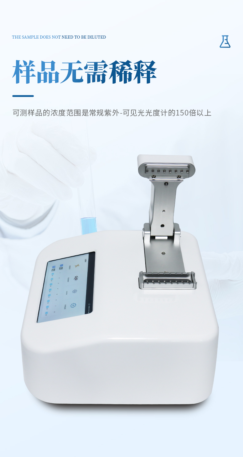 ●樣品濃度:樣品無需稀釋,可測樣品的濃度范圍是常規(guī)紫外-可見光光度計(jì)的150倍以上;