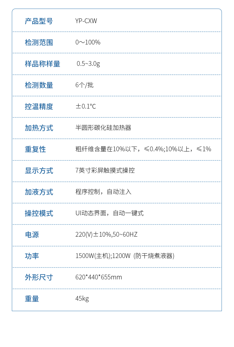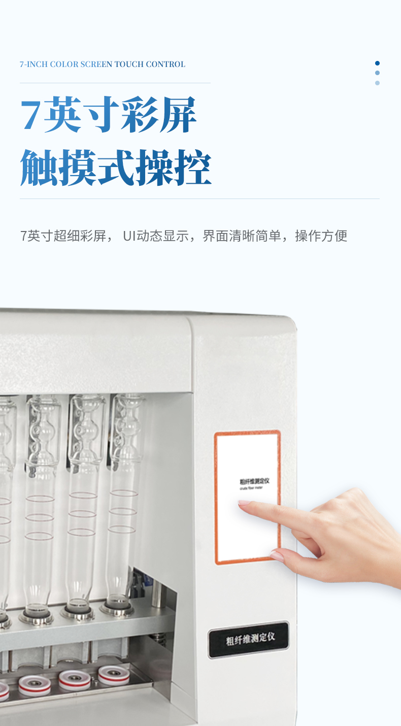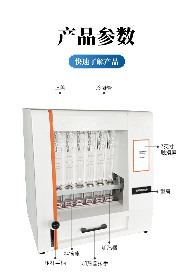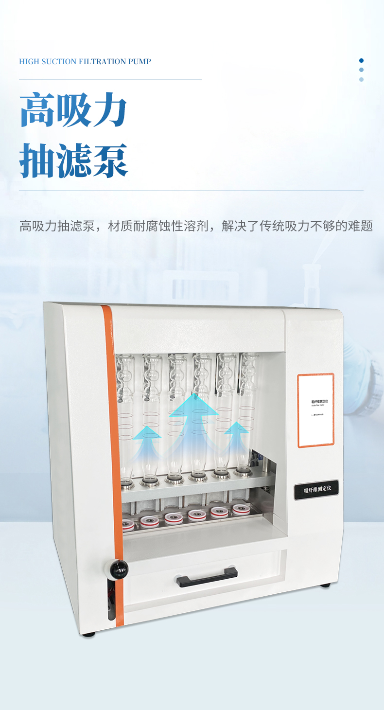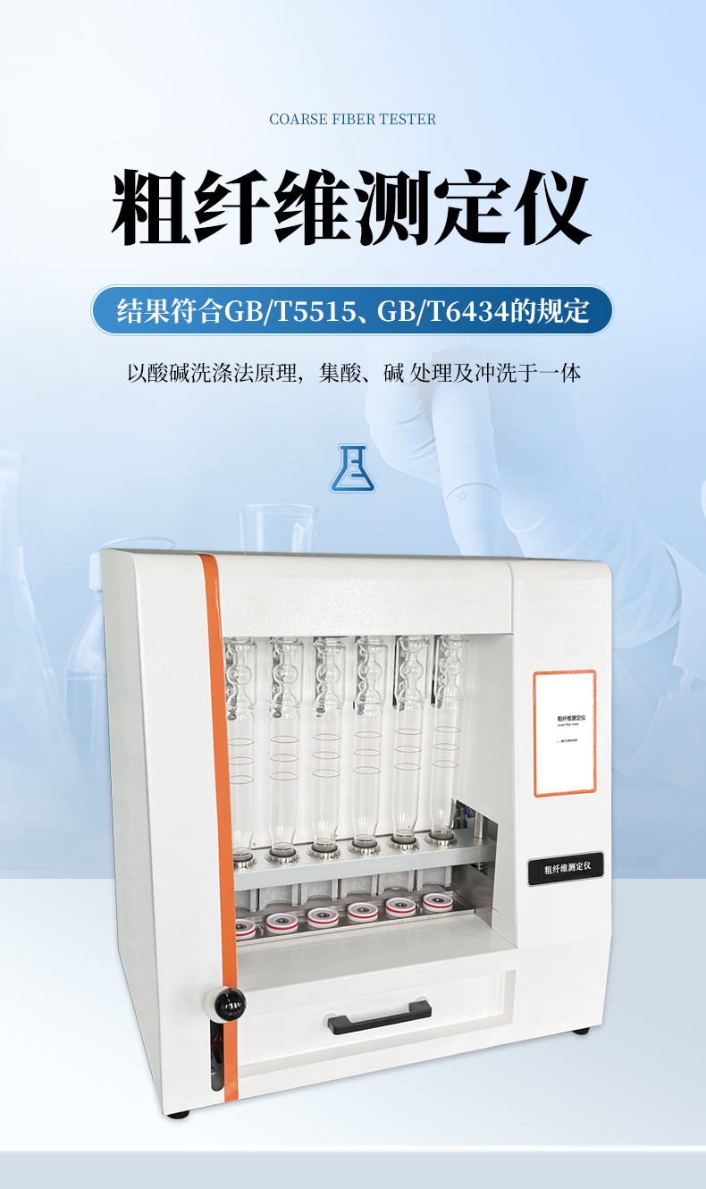 粗纖維測定儀是一款操作簡單、應(yīng)用靈活的纖維含量檢測儀器,可用于 傳統(tǒng)的溫德法檢測粗纖維和范式法檢測洗滌纖維。它是以酸堿洗滌法原理,集酸、堿 處理及沖洗于一體,采用全封閉電加溫、加液、消煮、抽濾、沖洗的方法來測定纖維 含量。適用于植物、飼料、食品及其它農(nóng)副產(chǎn)品中粗纖維的測定以及洗滌纖維、纖維 素、半纖維素和其它相關(guān)參數(shù)測試,其結(jié)果符合GB/T5515、GB/T6434的規(guī)定。
