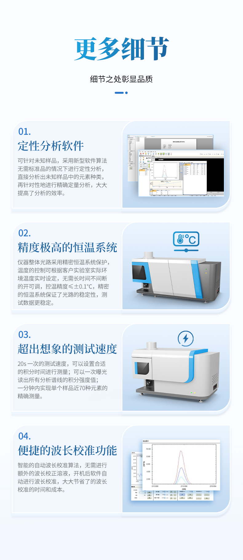 8、精度極高的恒溫系統: 儀器整體光路采用精密恒溫系統保護,溫度的控制可根據客戶實驗室實際環境溫度實時設定,無需長時間不間斷的開可調,控溫精度≤±0.1℃,精密的恒溫系統保證了光路的穩定性,測試數據更穩定。