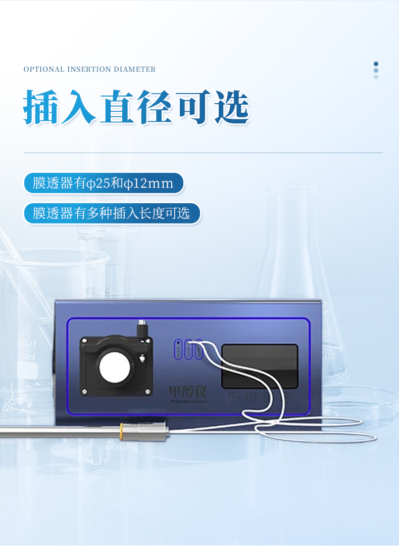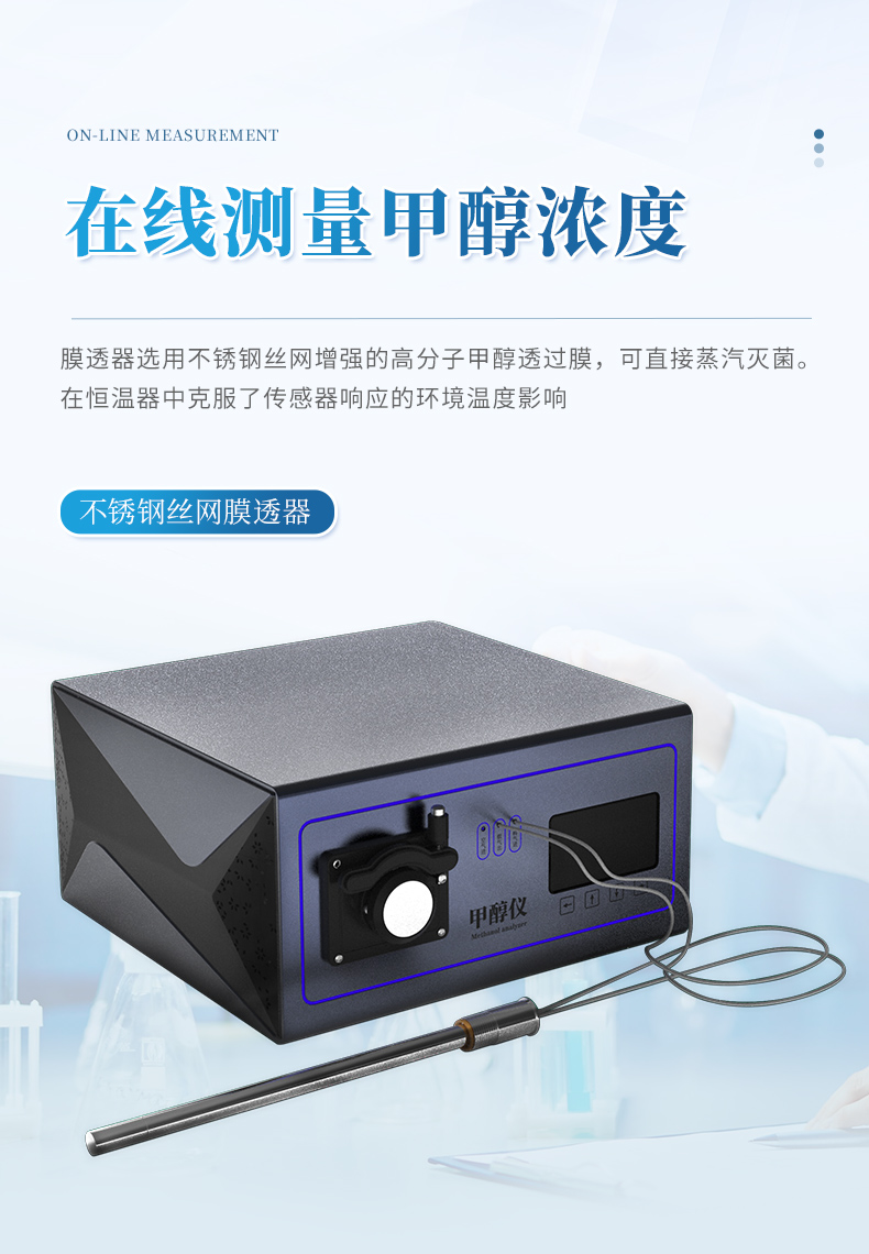 在線測量發酵液中甲醇濃度,膜透器選用了不銹鋼絲網增強的高分子甲醇透過膜,可直接蒸汽滅菌。檢測傳感器工作在恒溫器中克服了傳感器響應 的環境溫度影響,脫透器有φ25和φ12mm插入直徑可選,和有多種插入長 度可選,儀器具有非線性校正,程控標定,高低位報警,數字溫度補償和兩級密碼保護重要數據及菜單組態等功能
