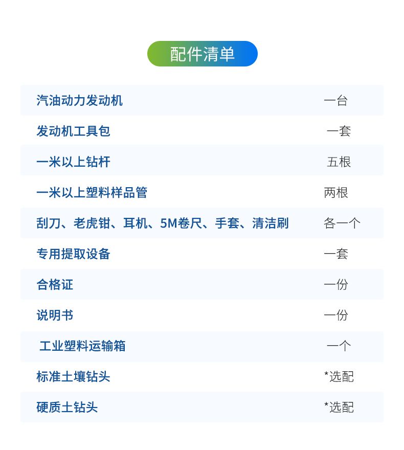 汽油動力發(fā)動機(jī)一臺,發(fā)動機(jī)工具包一套,標(biāo)準(zhǔn)土壤鉆頭、硬質(zhì)土鉆頭隨意選配,不小于1米的鉆桿5根、不小于1米的塑料樣品管2根,刮刀、老虎鉗、耳機(jī)、5M卷尺、手套、清潔刷各1個,專用提取設(shè)備1套、工業(yè)塑料運(yùn)輸箱1個