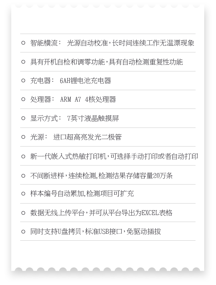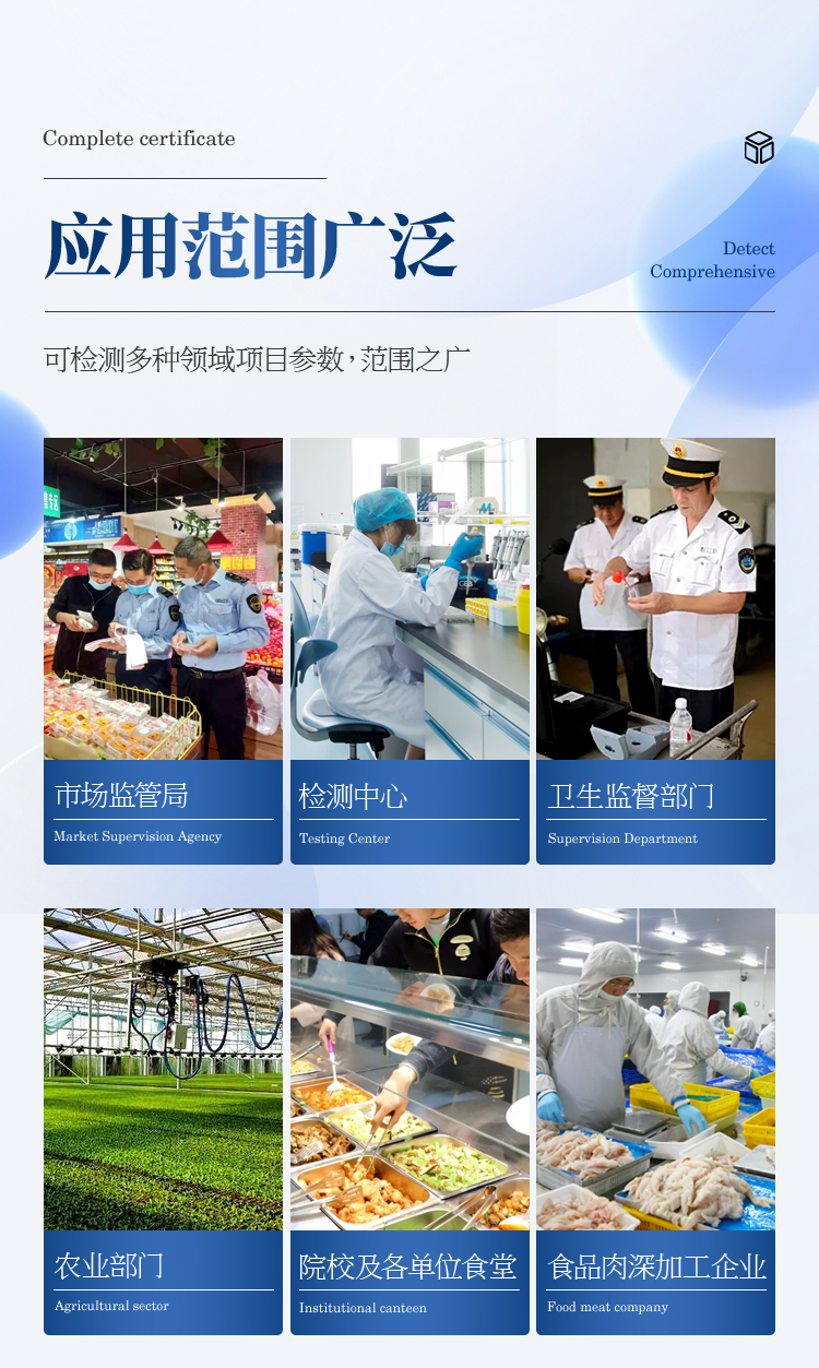 可快速檢測各類食品中的亞硝酸鹽、二氧化硫、甲醛、吊白塊、雙氧水、硼砂、農(nóng)藥殘留、乳及乳制品中蛋白質(zhì)、硝酸鹽、重金屬鉛的含量,儀器預(yù)留其他項目檢測程序和端口,根據(jù)日后需求可方便的自主增加檢測項目。