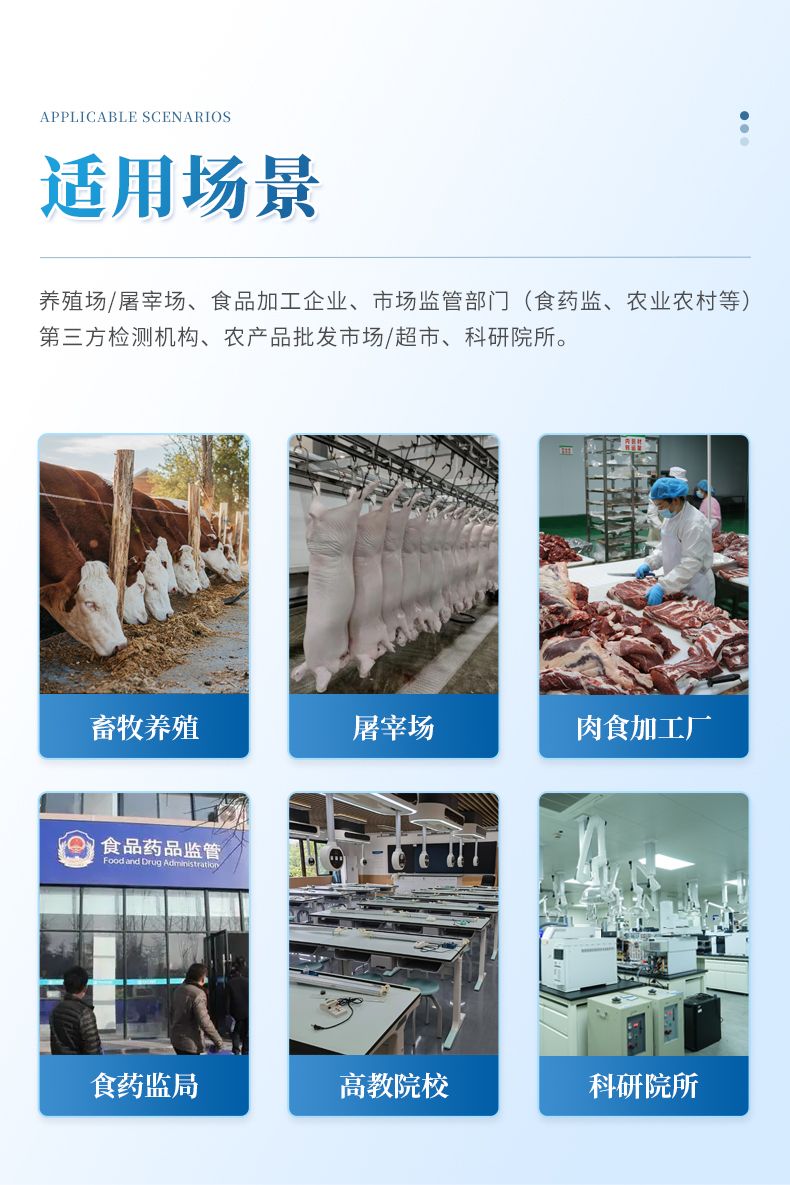 該獸藥殘留檢測儀適用于豬、雞、鴨、羊、牛、牛奶等畜禽肉產品中獸藥殘留,包括抗生素類殘留、瘦肉精激素類殘留和水產品有毒有害物質的現場快速篩查定及定性定量檢測。 該多功能獸藥殘留檢測儀為集成化肉品安全快速檢測分析設備,可廣泛應用于畜牧養殖場、屠宰場、食品肉產品深加工企業、食藥監局、檢驗檢疫部門、衛生部門、高教院校、科研院所、農業部門等單位使用。