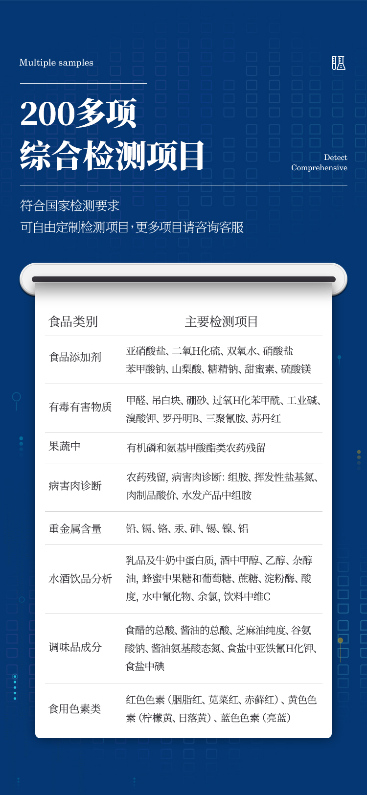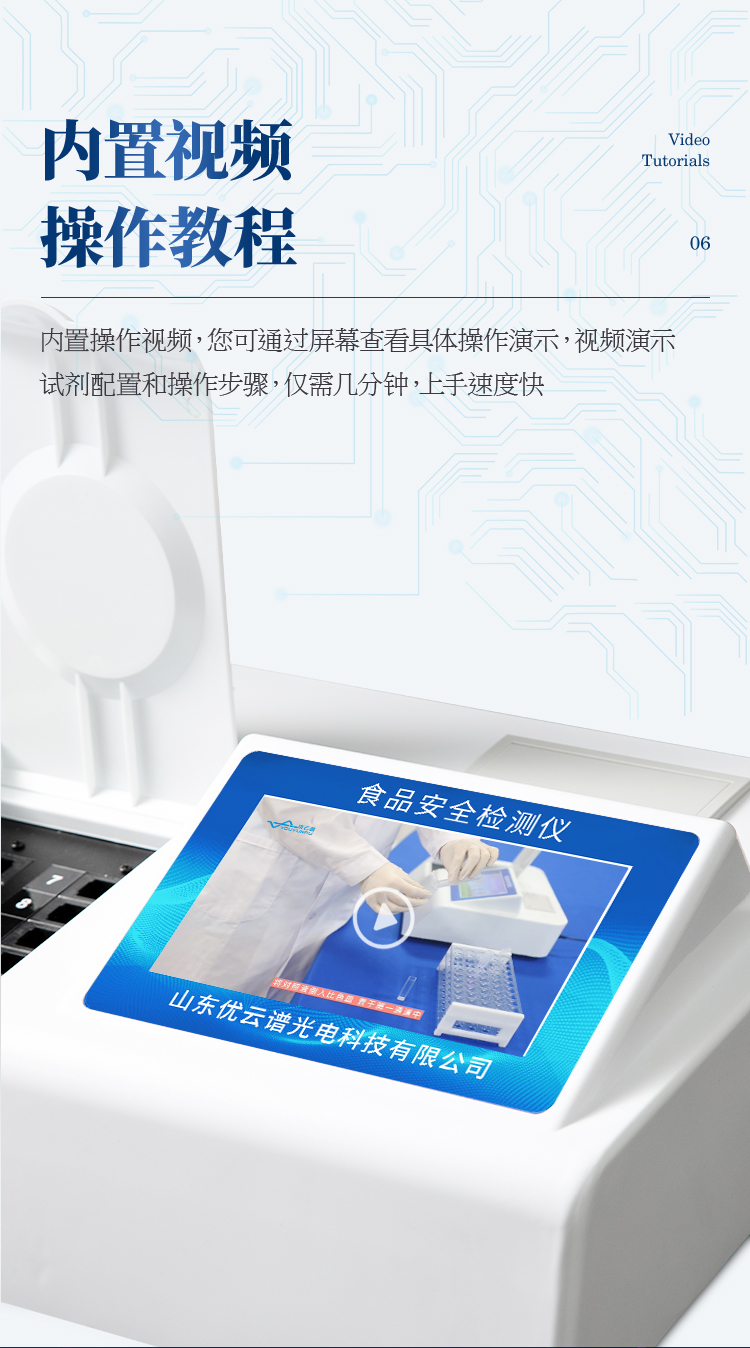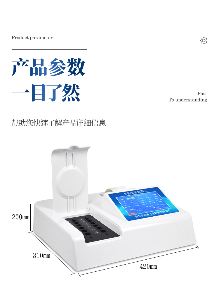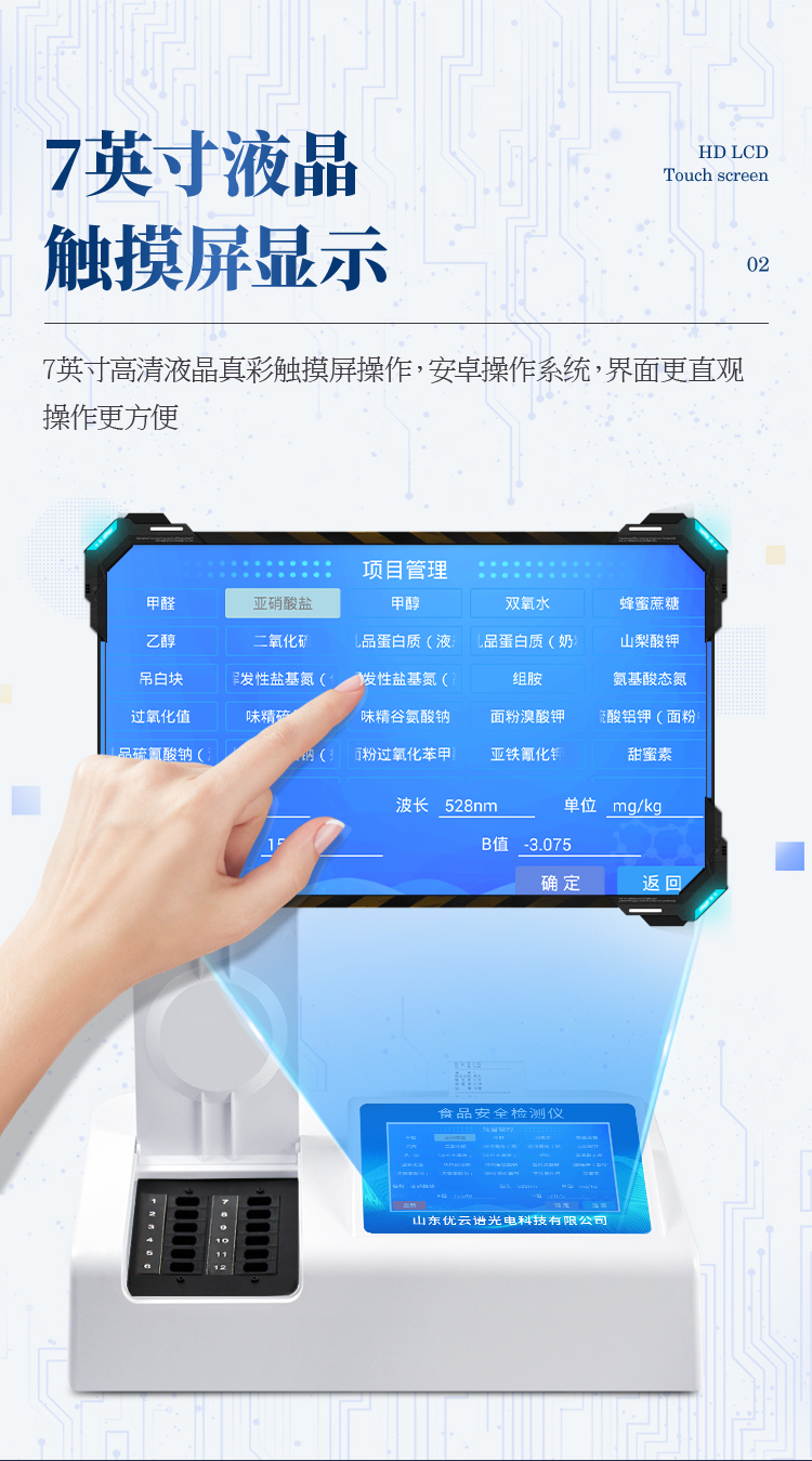 可快速檢測各類食品中的亞硝酸鹽、二氧化硫、甲醛、吊白塊、雙氧水、硼砂、農藥殘留、乳及乳制品中蛋白質、硝酸鹽、重金屬鉛的含量,儀器預留其他項目檢測程序和端口,根據日后需求可方便的自主增加檢測項目。