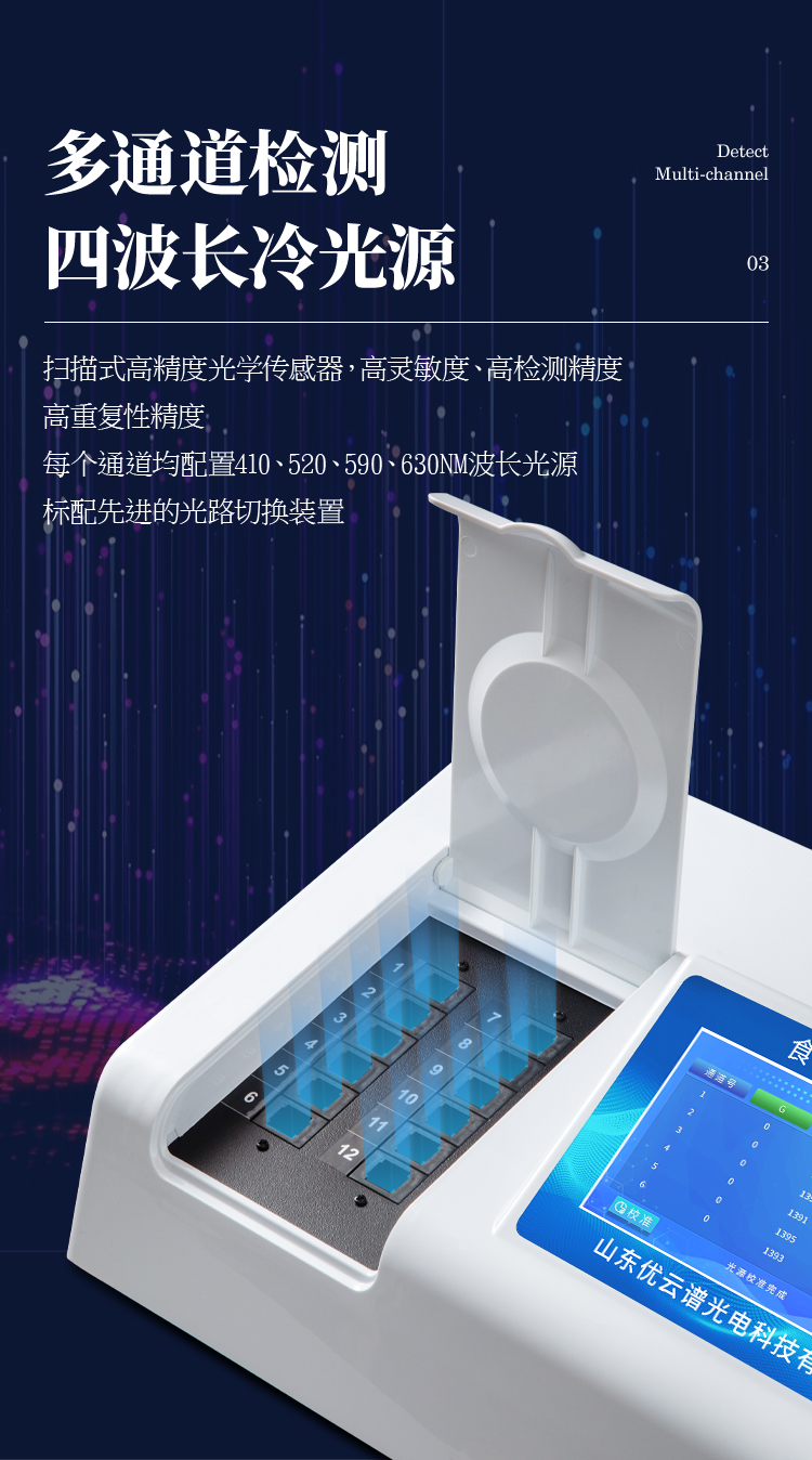3、四波長冷光源,每個通道均配置410、520、590、630nm波長光源,標配先進的光路切換裝置,專利光路切換功能可實現最多64波長,并且所有檢測項目可實現所有通道同時檢測。