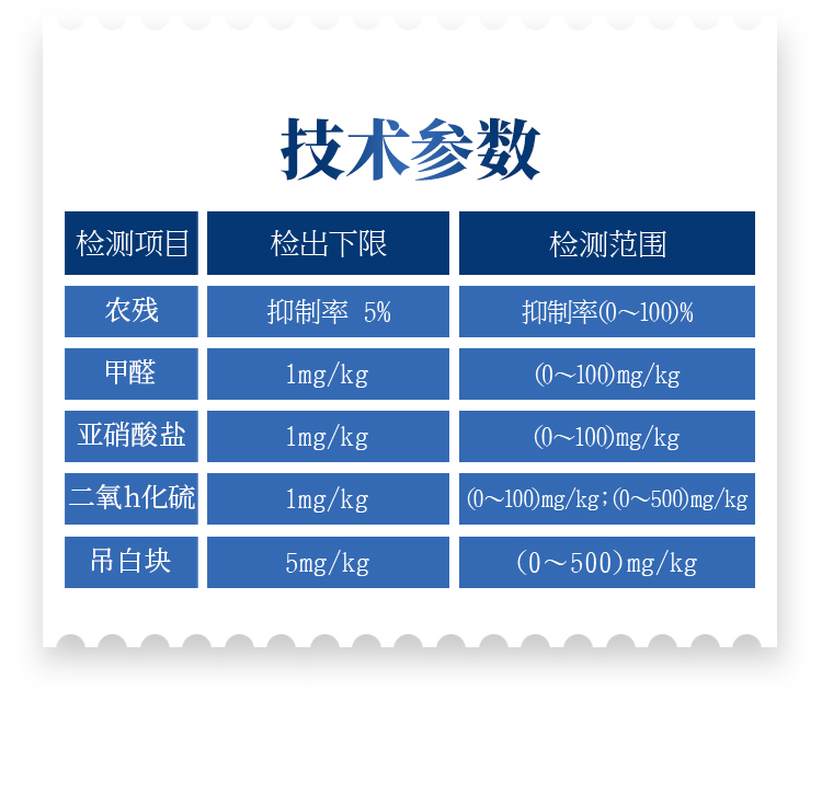 1、農 殘: 檢出下限:抑制率 5% ,檢測范圍:抑制率(0~100)%