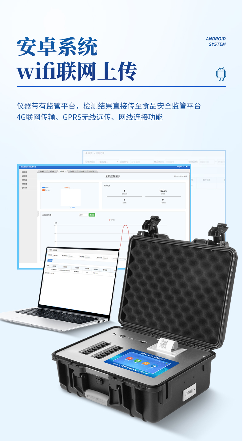4、儀器帶有監管平臺,數據可局域網和互聯網數據上傳,檢測結果直接傳至食品安全監管平臺。進行區域食品安全監管及大數據分析處理與數據統計,檢測區域食品安全長短期動態,達到食品安全問題預估、預警