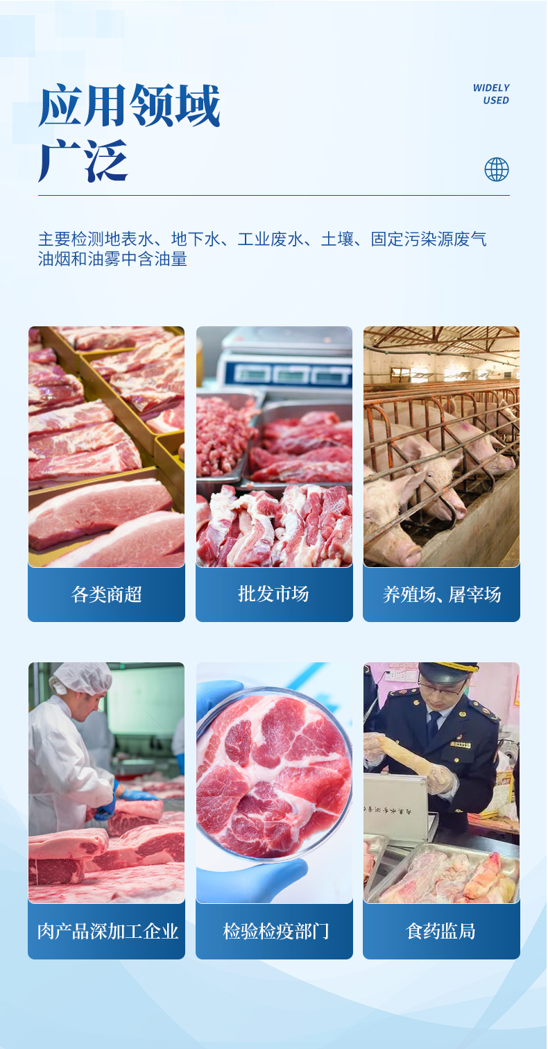 該多功能肉類檢測儀為集成化肉品安全快速檢測分析設備,廣泛應用于養殖場、屠宰場、食品肉產品深加工企業、檢驗檢疫部門、食藥監局、衛生部門、高教院校、科研院所、農業部門等單位使用。