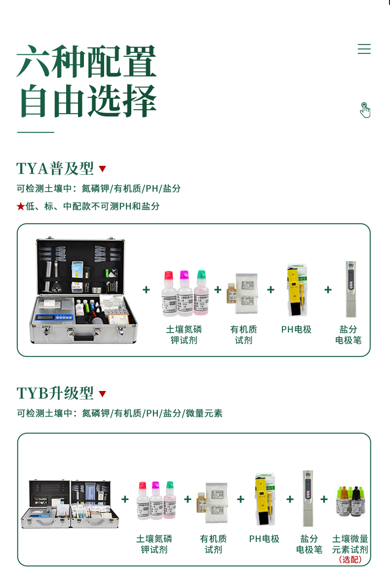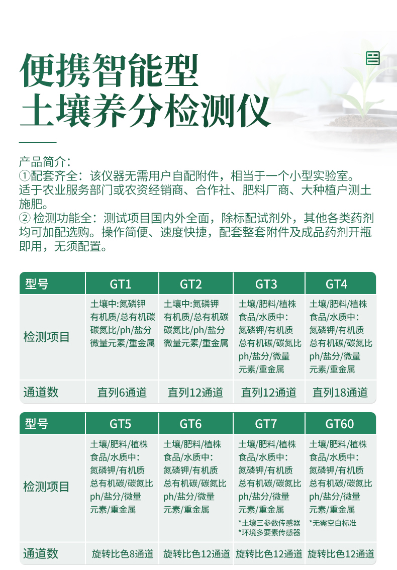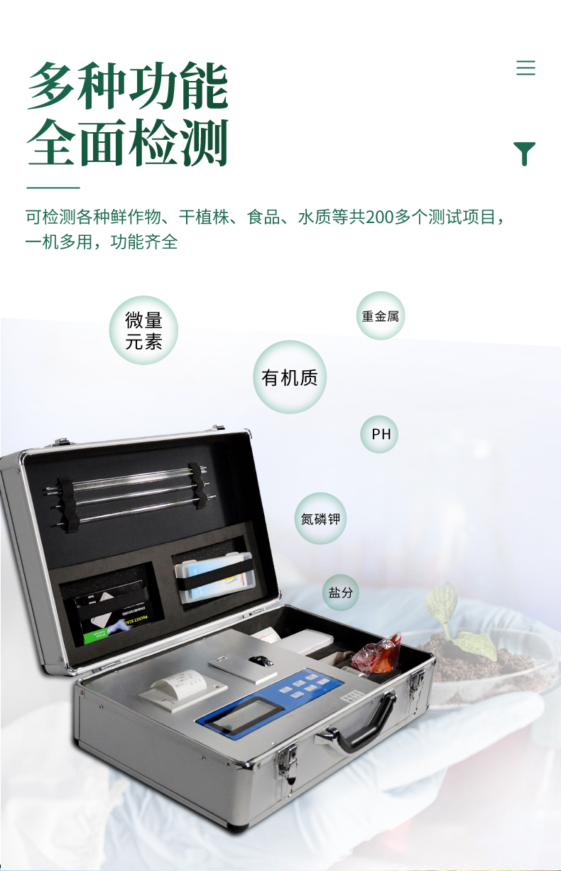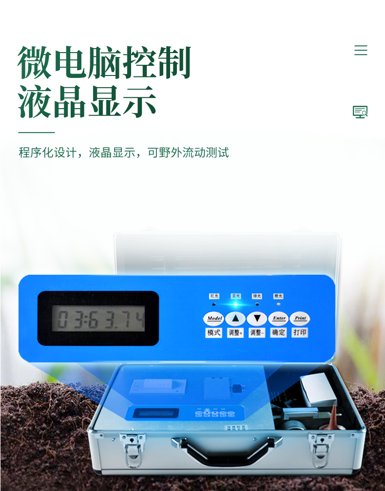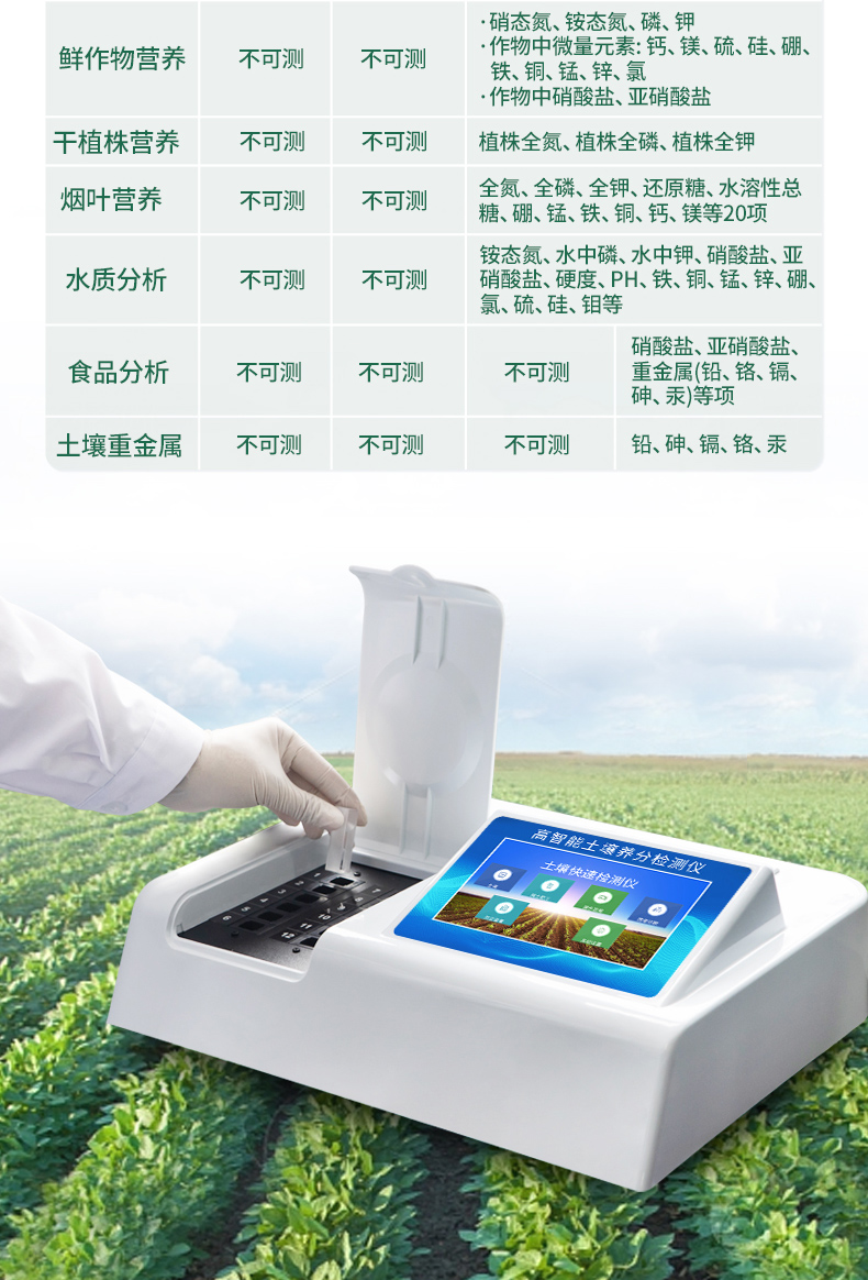 4、可檢測土壤中的速效氮、有效磷、速效鉀、全氮、全磷、全鉀、有機質(zhì)含量,土壤酸堿度,含鹽量。