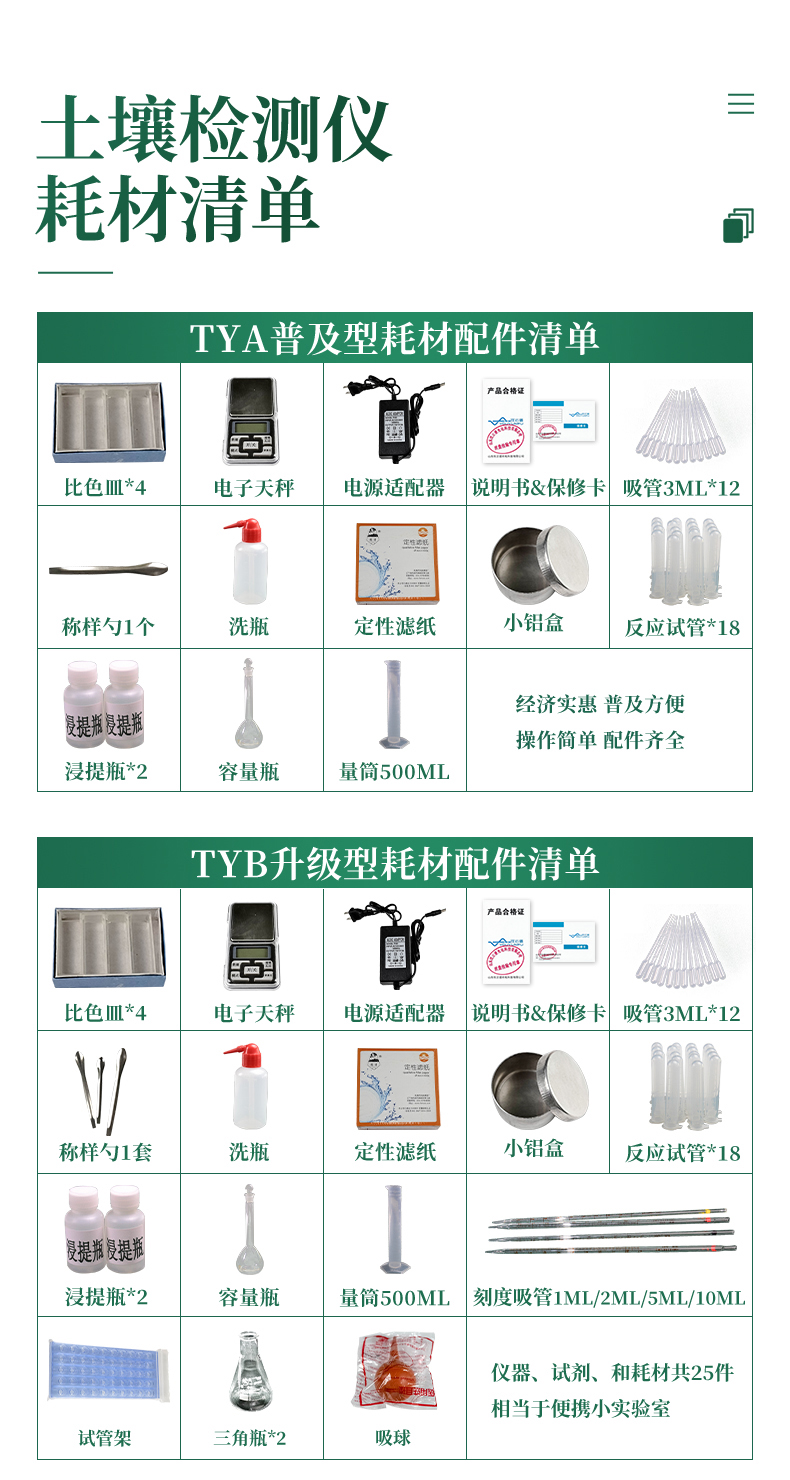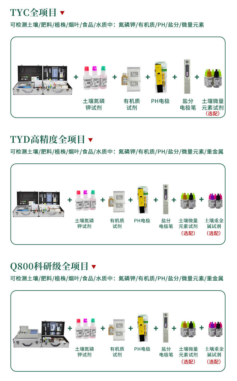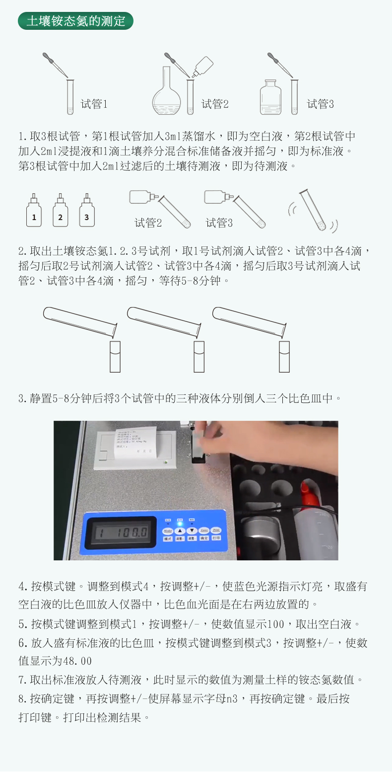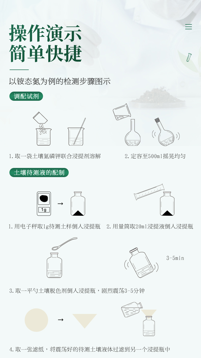 土壤養(yǎng)分:● 銨態(tài)氮、速效磷、速效鉀、水份、有機質(zhì)、酸堿度(pH試紙法)等項;