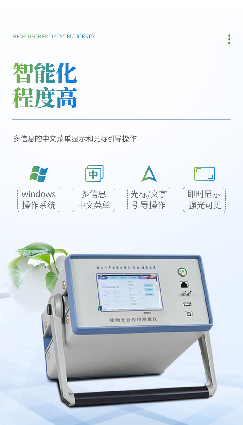 智能化:采用windows 操作系統,觸摸顯示屏。多信息的中文菜單顯示和文字引導操作,即時將測定過程及最終結果屏幕顯示、存儲。并可顯示Pn曲線、Tr曲線、光-光合曲線以及濕度-蒸騰曲線;