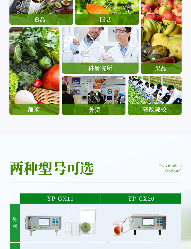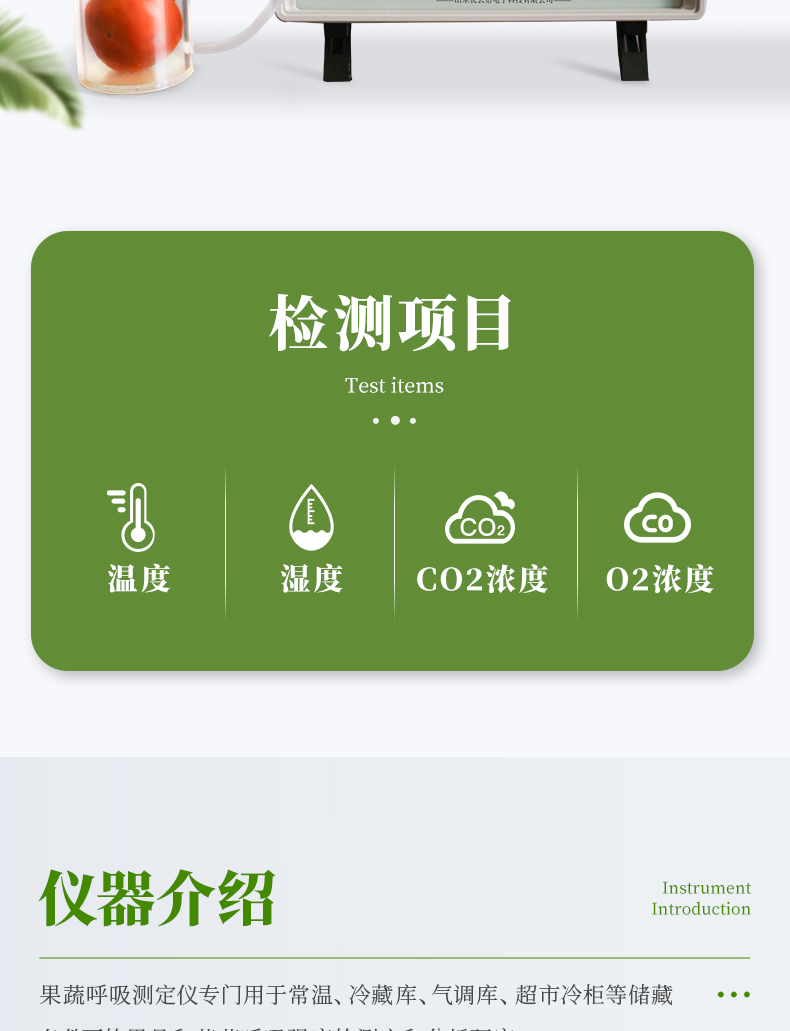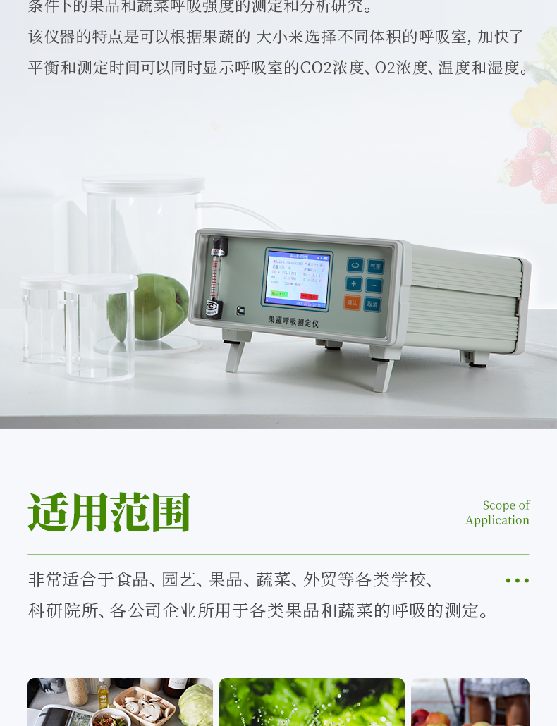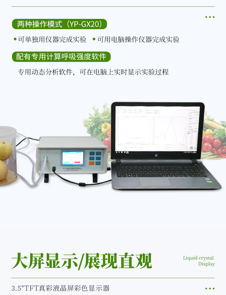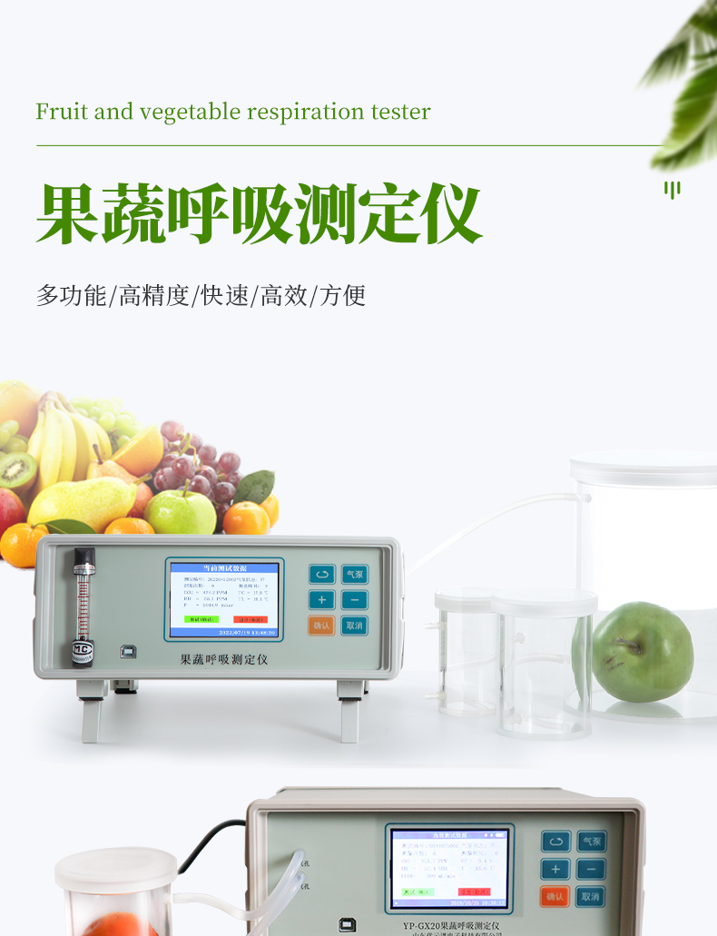 YP-GX20新型果蔬呼吸儀采用雙波長紅外二氧化碳分析器,3.5寸TFT 真彩液晶顯示器,專門用于常溫、冷藏庫、氣調(diào)庫、超市冷柜等儲藏條件下的果品和蔬菜呼吸強度的測定和分析研究。該儀器的特點是可以根據(jù)果蔬的大小來選擇不同體積的呼吸室,加快了平衡和測定時間;可以通過電腦直接操作儀器,同時顯示呼吸室的CO2濃度、O2濃度、溫度和濕度及變化曲線。