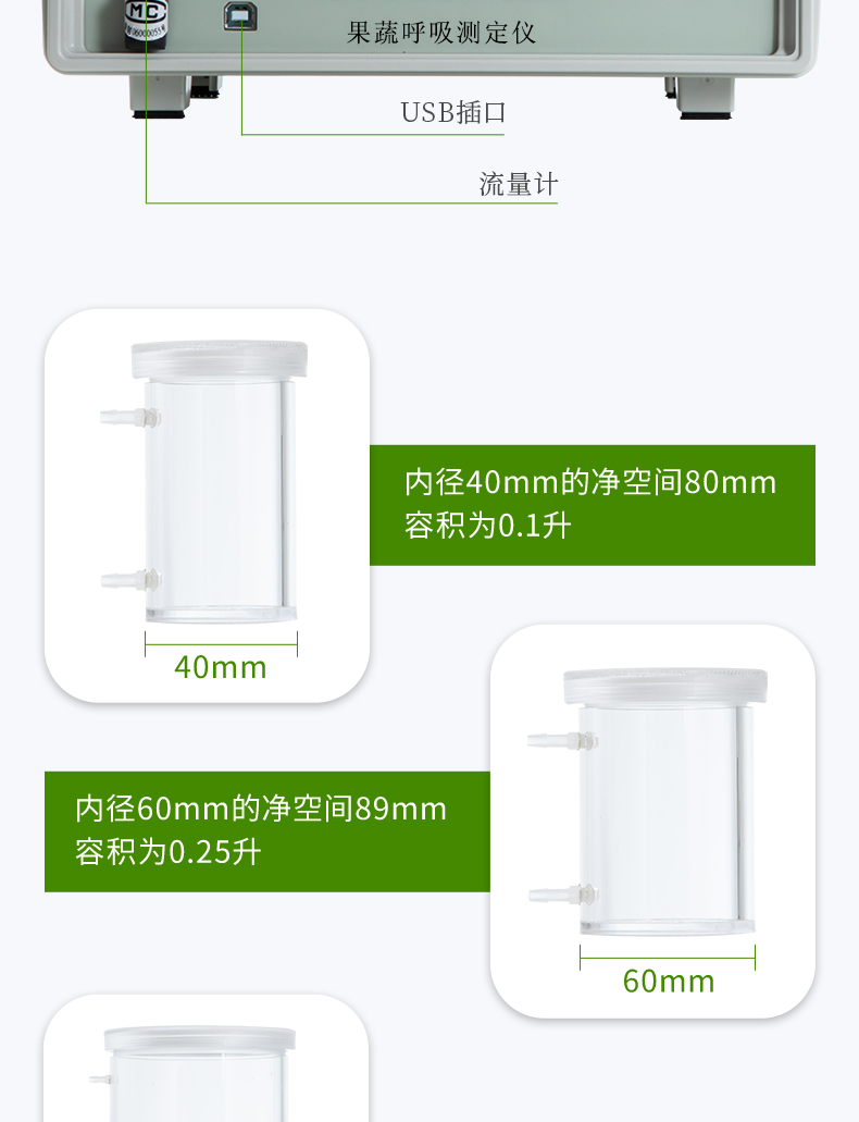 4、氣體流量通過儀器或電腦設(shè)定。可以進(jìn)行不同流量下果蔬呼吸強度的試驗。