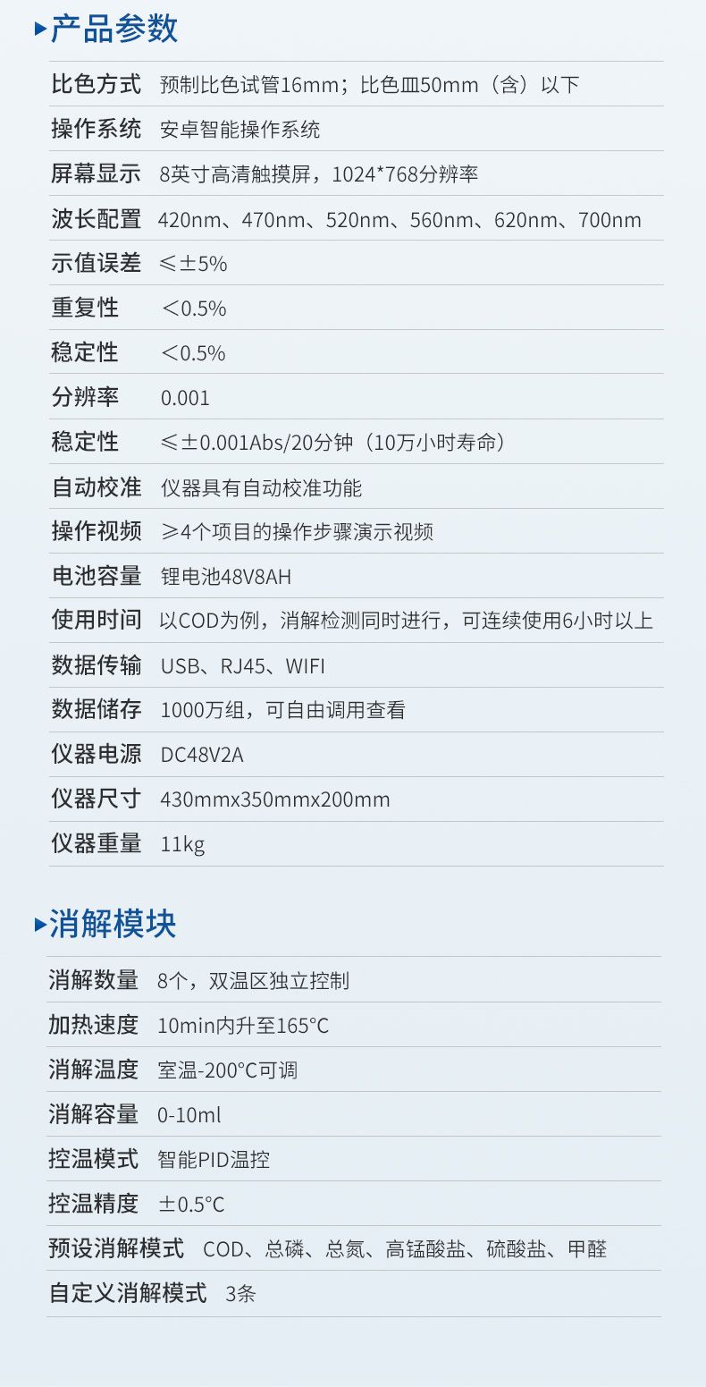 4、內置雙溫區8孔消解儀,左右溫區獨立控制,可對COD總磷總氮等進行快速消解。